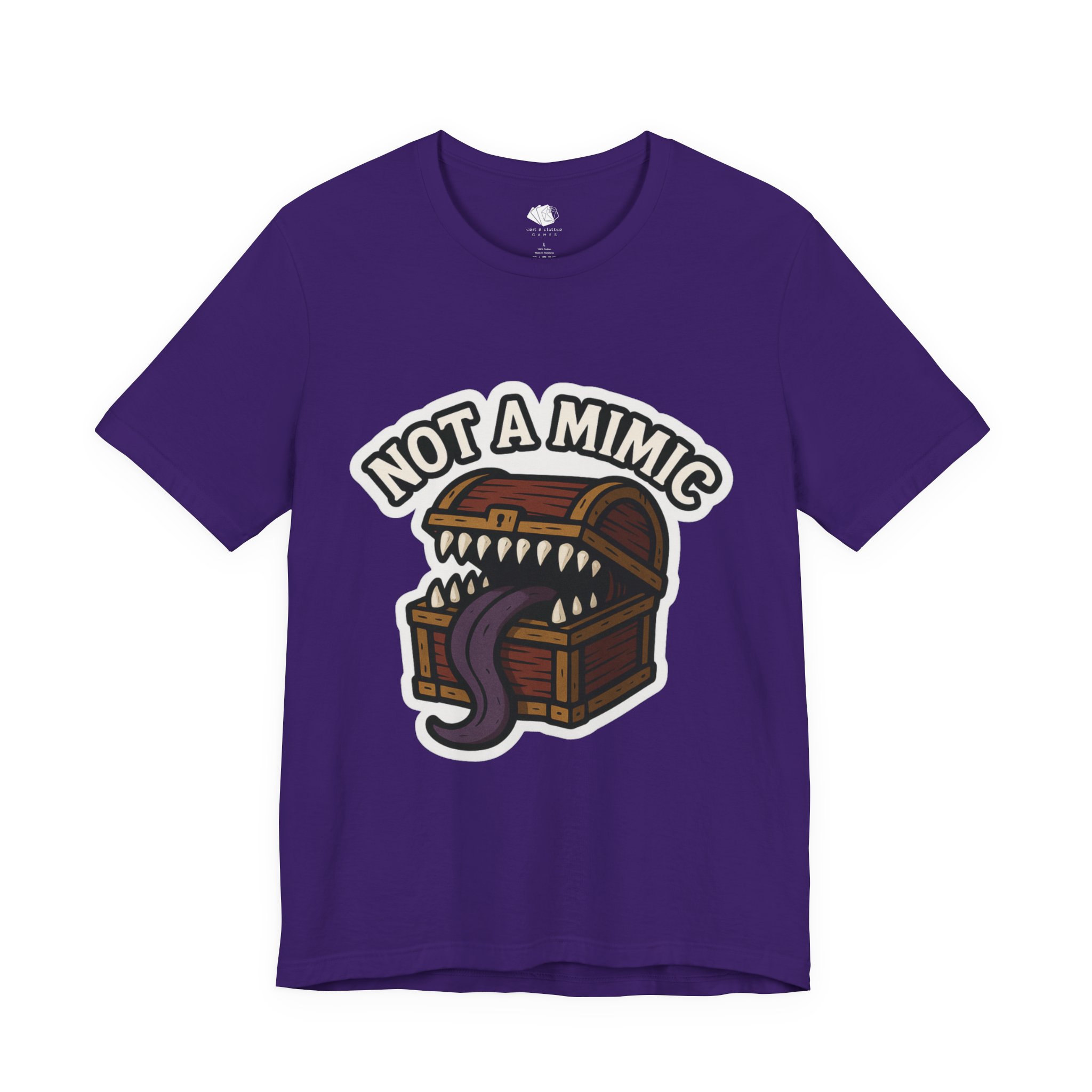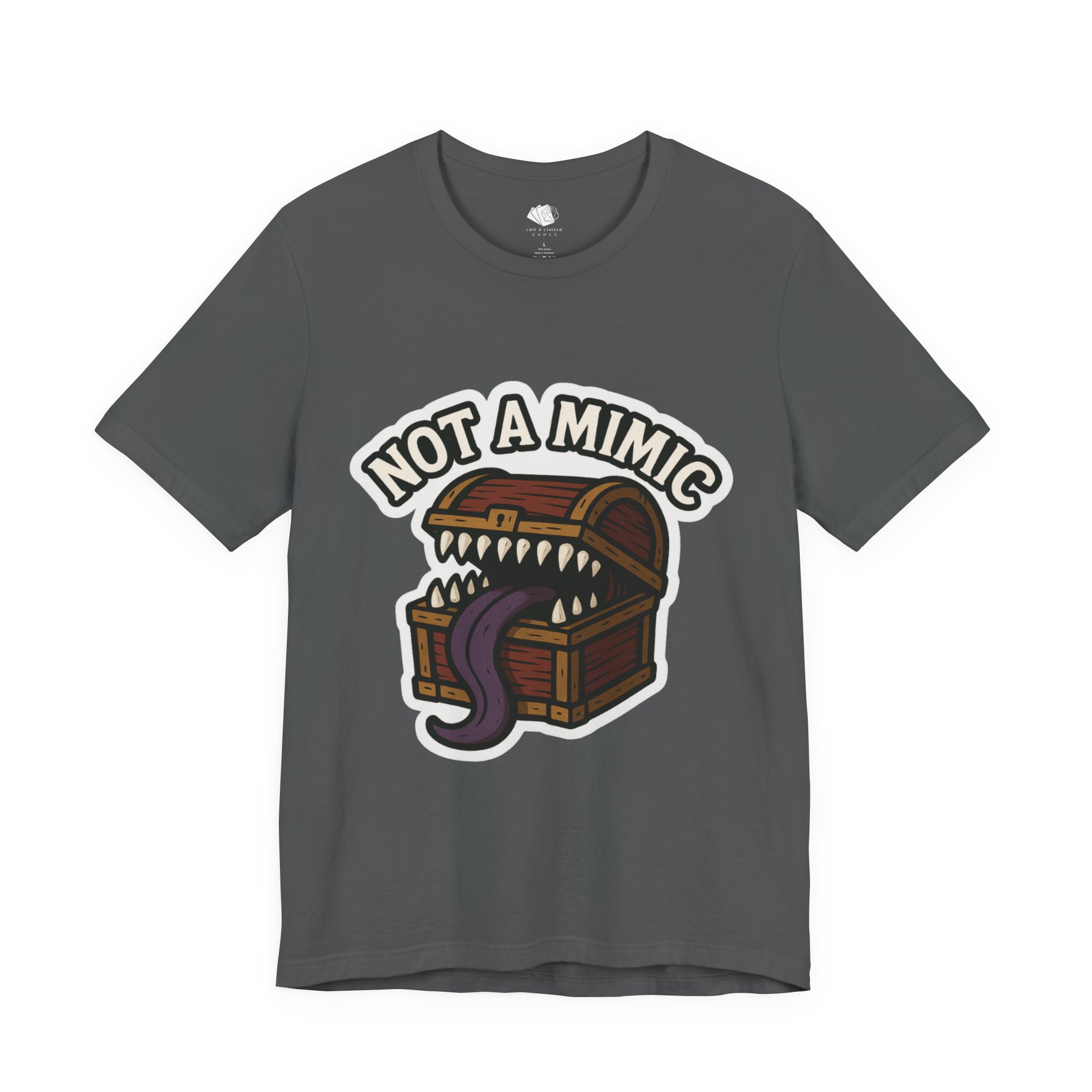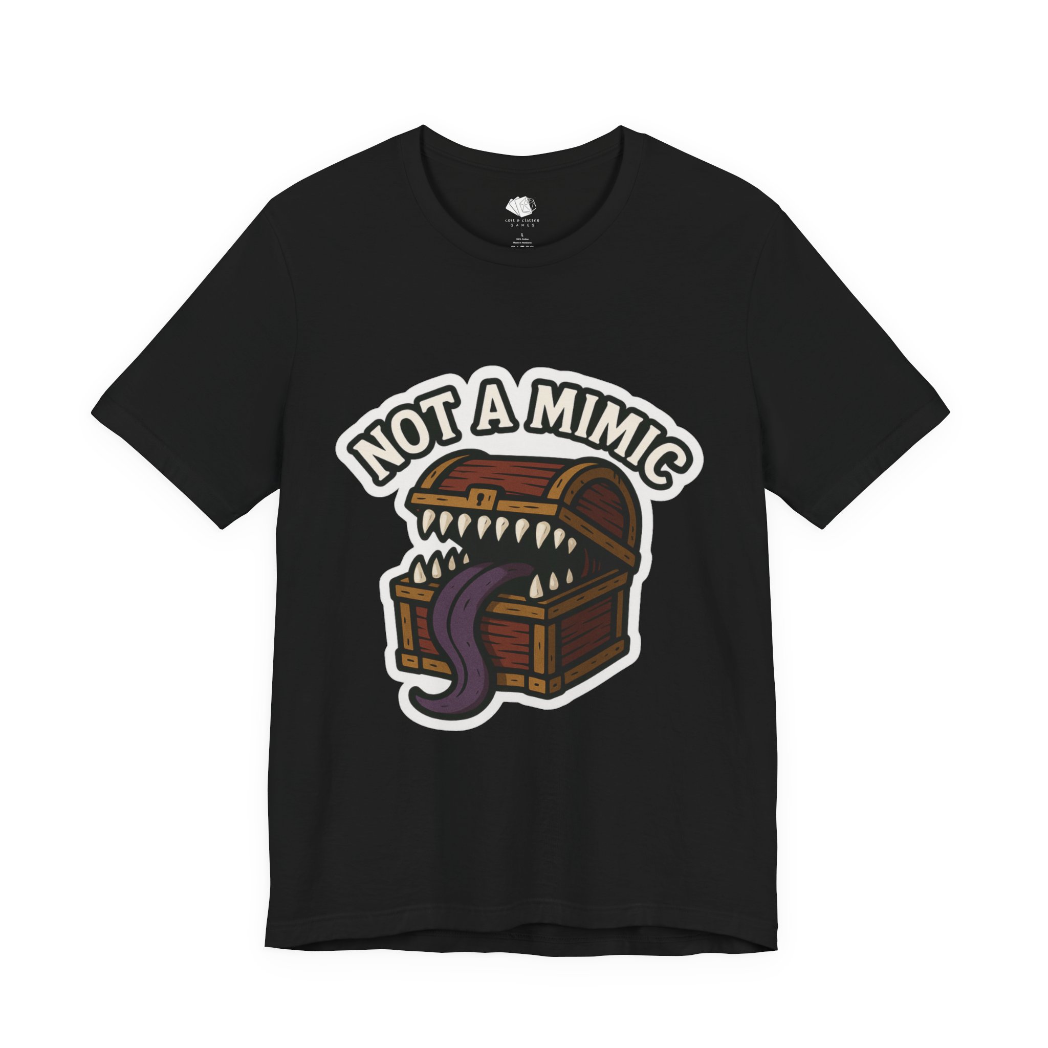 Adventurers beware—this chest might bite back! The Not A Mimic Tee features a bold cartoon treasure chest with sharp teeth and a curling purple tongue, paired with the tongue-in-cheek phrase “Not A Mimic.” Perfect for tabletop gamers who love a good inside joke, this shirt is equal parts playful and stylish.