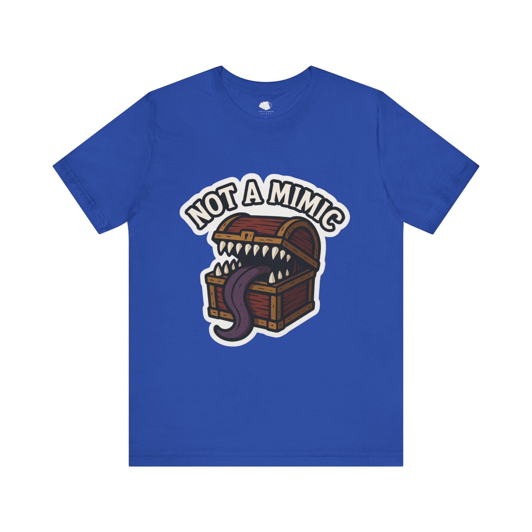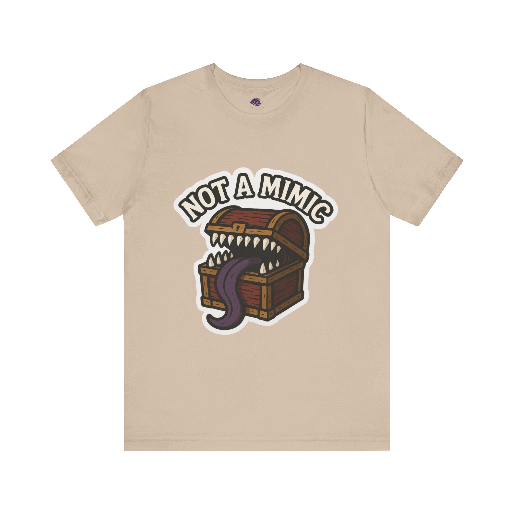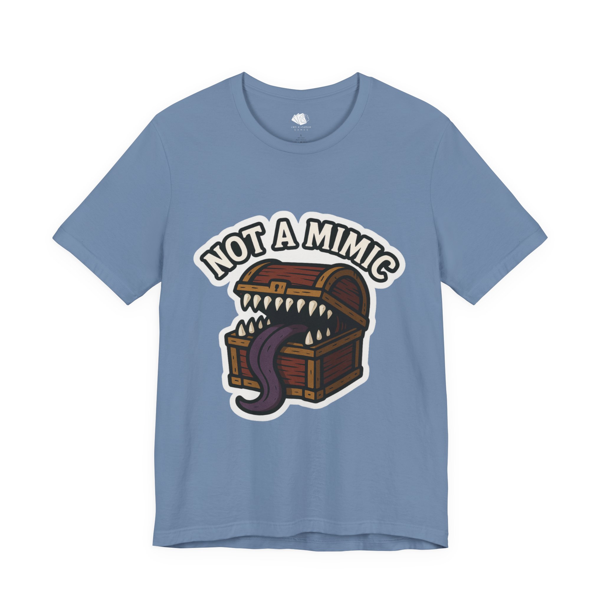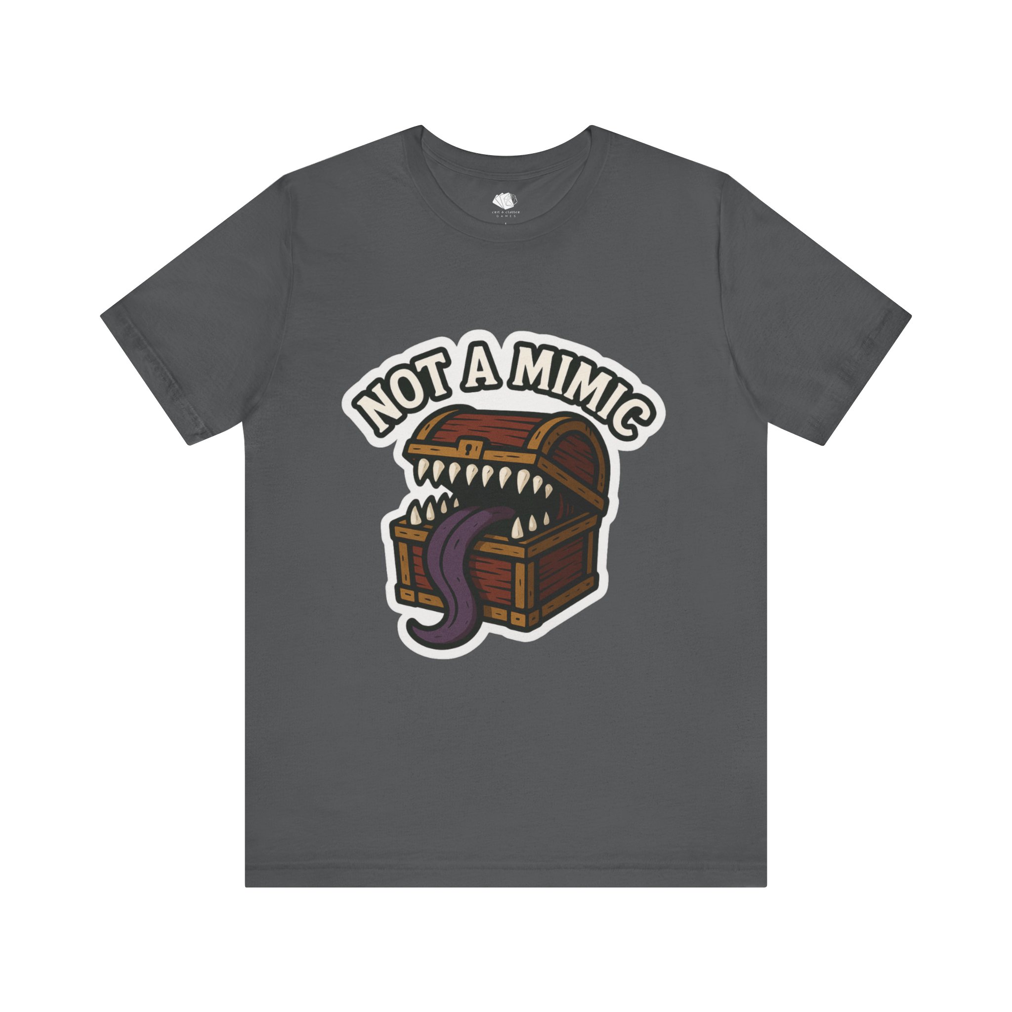 Adventurers beware—this chest might bite back! The Not A Mimic Tee features a bold cartoon treasure chest with sharp teeth and a curling purple tongue, paired with the tongue-in-cheek phrase “Not A Mimic.” Perfect for tabletop gamers who love a good inside joke, this shirt is equal parts playful and stylish.