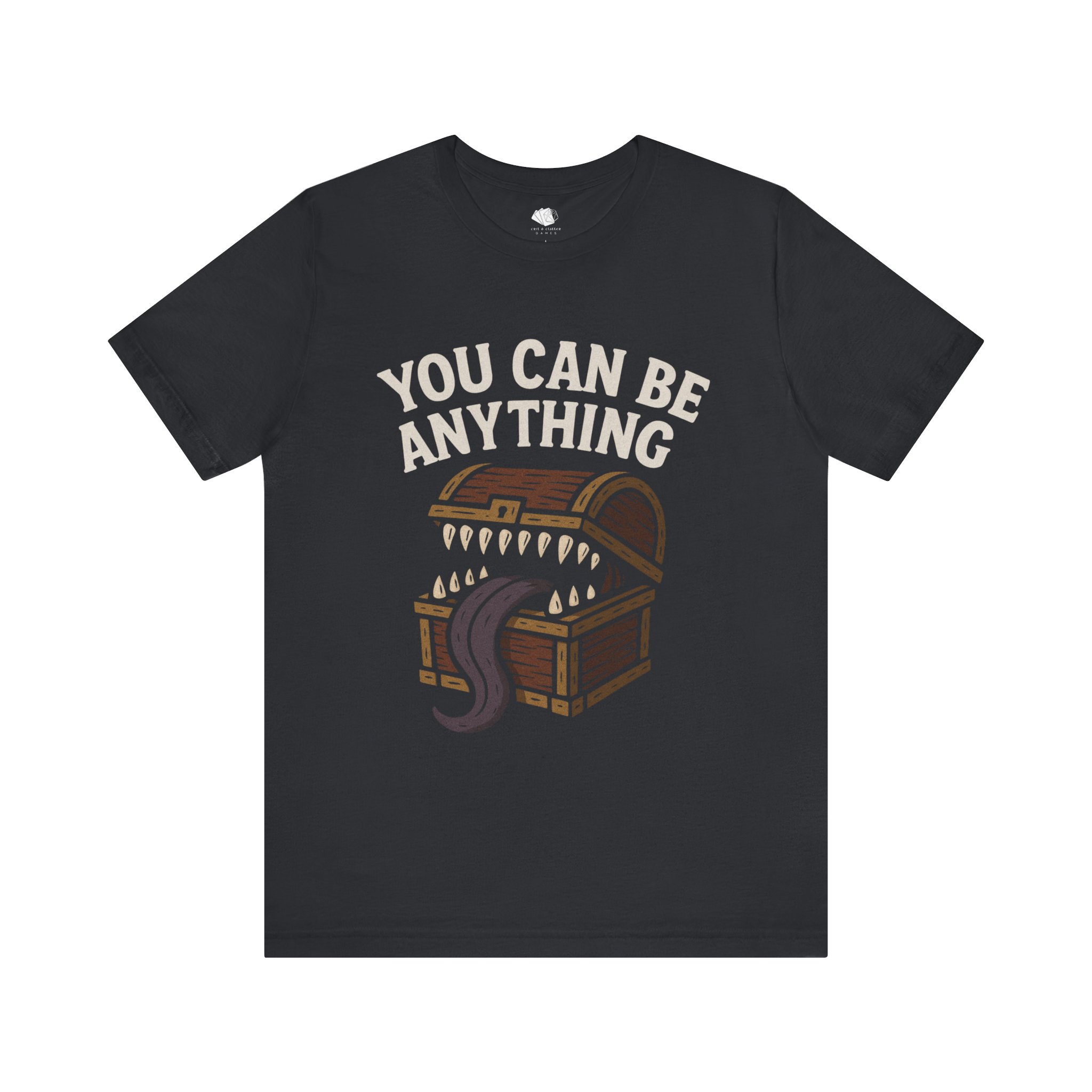 Celebrate the chaotic charm of D&D’s favorite shapeshifter with the You Can Be Anything Mimic Tee. Featuring a toothy chest mimic with its long tongue on display, this design pairs perfectly with the motivational (and mischievous) slogan, “You Can Be Anything.” It’s equal parts geeky humor and adventuring inspiration.